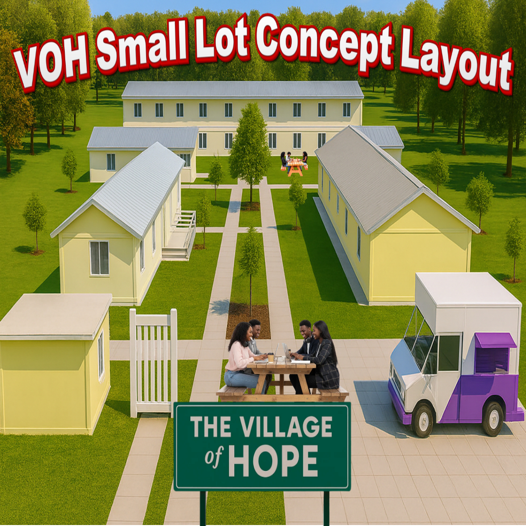 The Resident Pathway can be implemented in multiple village formats. This Small Lot Concept Layout is a compact, efficient model designed for smaller parcels of land while still providing dignity, structure, and community. It demonstrates how the Village of HOPE can scale to meet the needs of different neighborhoods and municipalities.